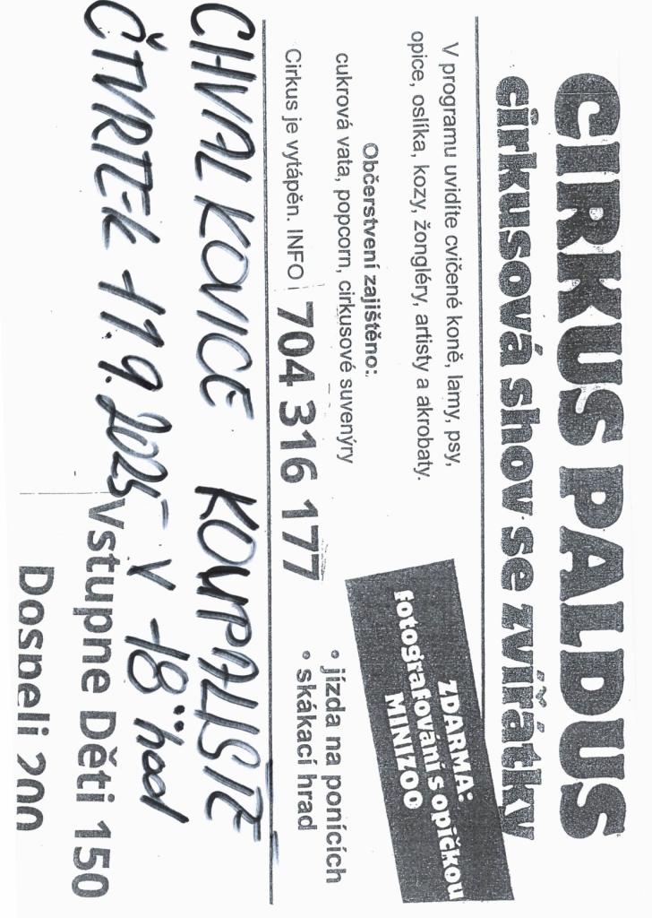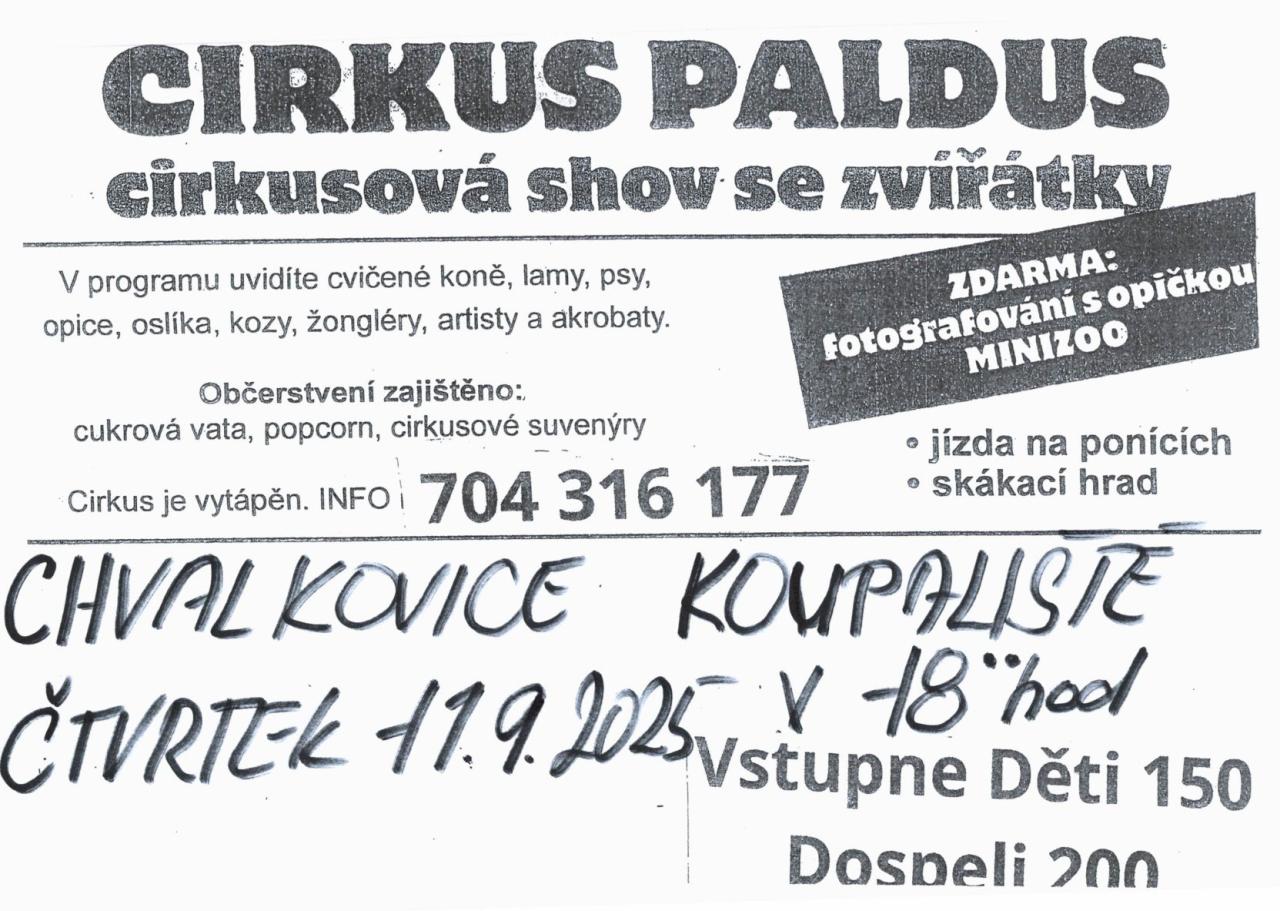 Cirkus Paldus čtvrtek 11.9.2025 na koupališti ve Chvalkovicích od 18:00hod